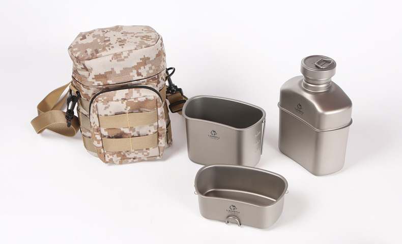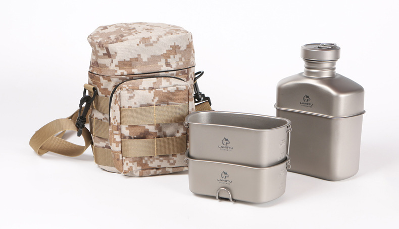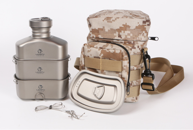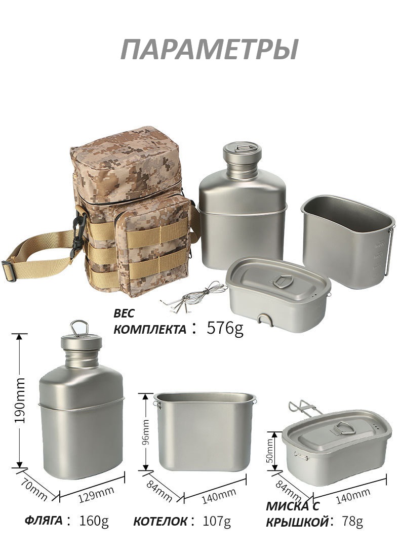 Офицерский комплект прочной, лёгкой и высокотехнологичной армейской посуды из титанового сплава, отличающегося долговечностью и химической нейтральностью к любой пище.