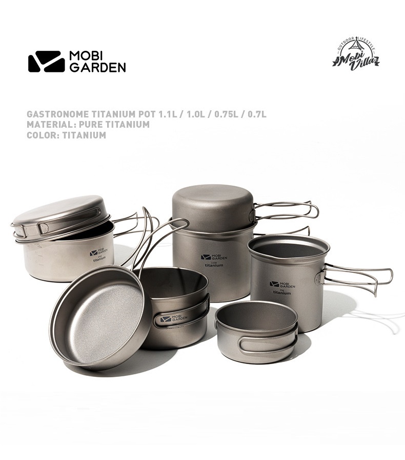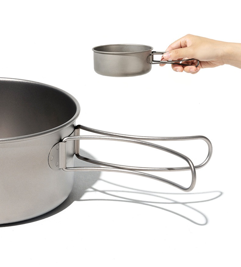 Все предметы снабжены складными ручками из титана, которые не нагреваются и позволяют удобно держать посуду в руках.