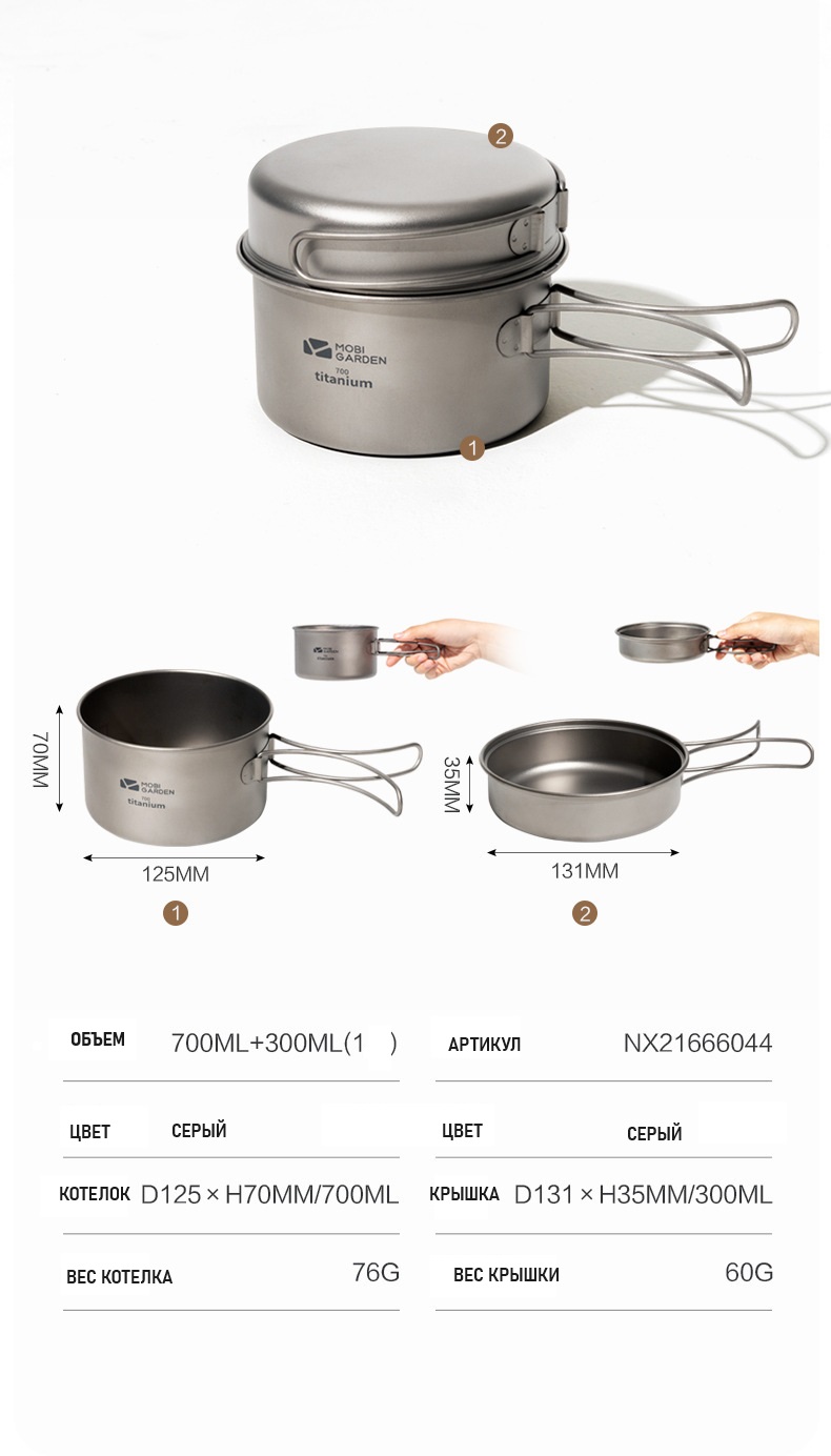 Компактный и суперлёгкий комплект из котелка объемом 0,7 л и крышки объемом 0,3 л, которая может быть как тарелкой, так и сковородкой.