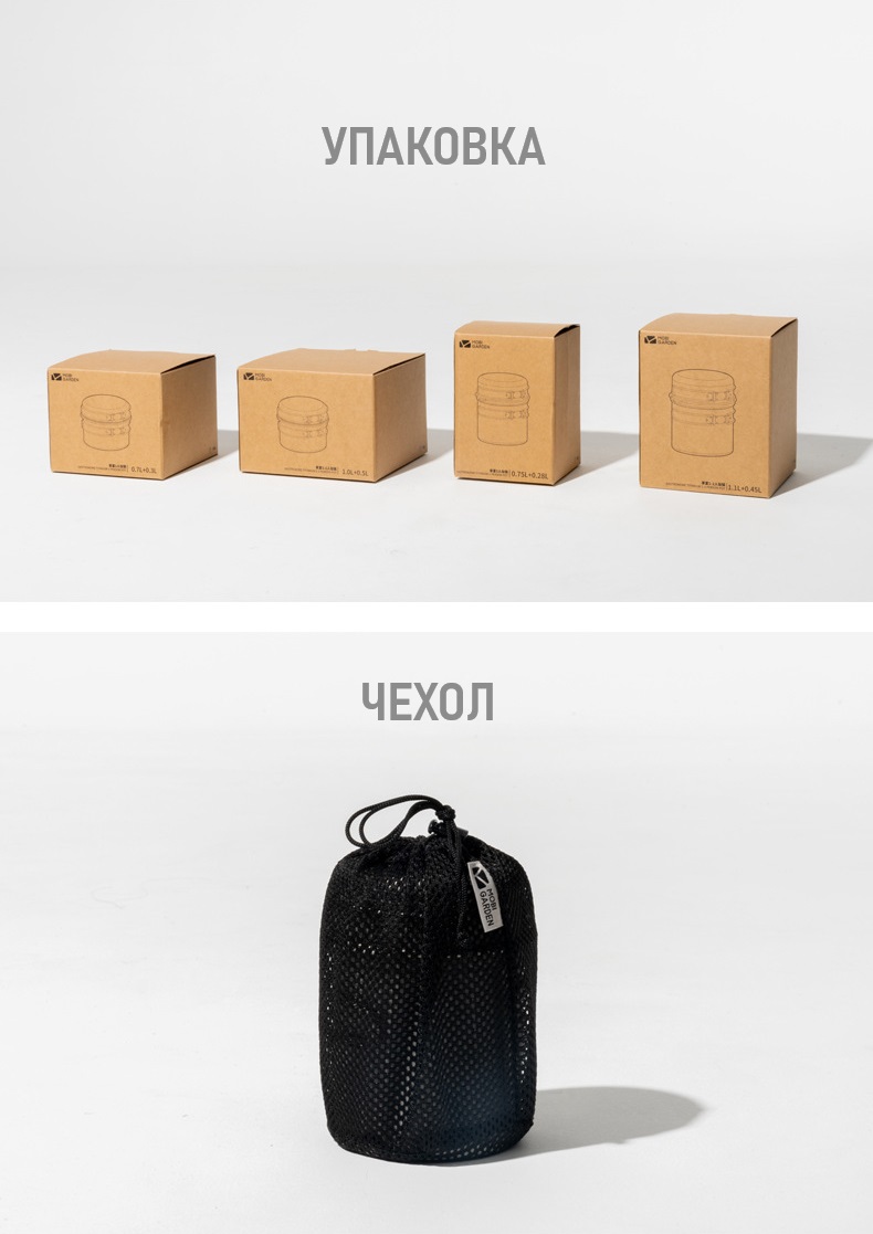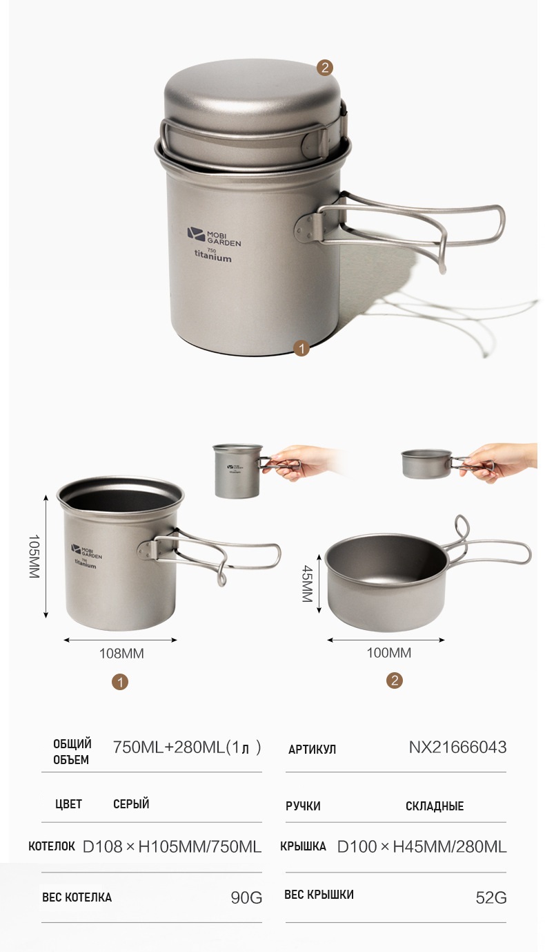 Все предметы снабжены складными ручками из титана, которые не нагреваются и позволяют удобно держать посуду в руках.