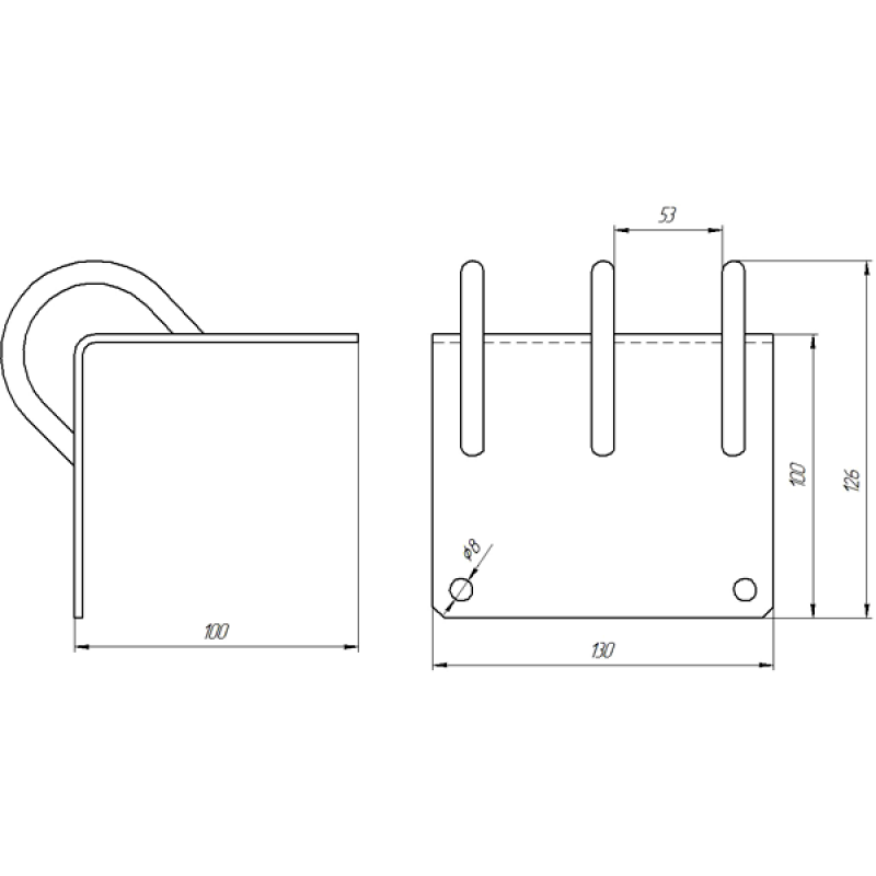 Протектор для канатов «L-пластина» представляет собой согнутую под углом в 90 градусов стальную пластину с достаточно большим радиусом закругления. Три направляющие дуги по внешнему углу пластины служат для удерживания пары защищаемых канатов от поперечного сдвига за плоскости пластины протектора.